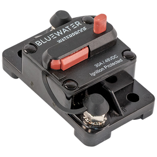 Ασφαλειοδιακόπτης επιφανειακής τοποθέτησης BLUEWATER, διαθέτει μοχλό επαναφοράς και χρησιμοποιείται συνήθως σε βοηθητικά κυκλώματα σκαφών.