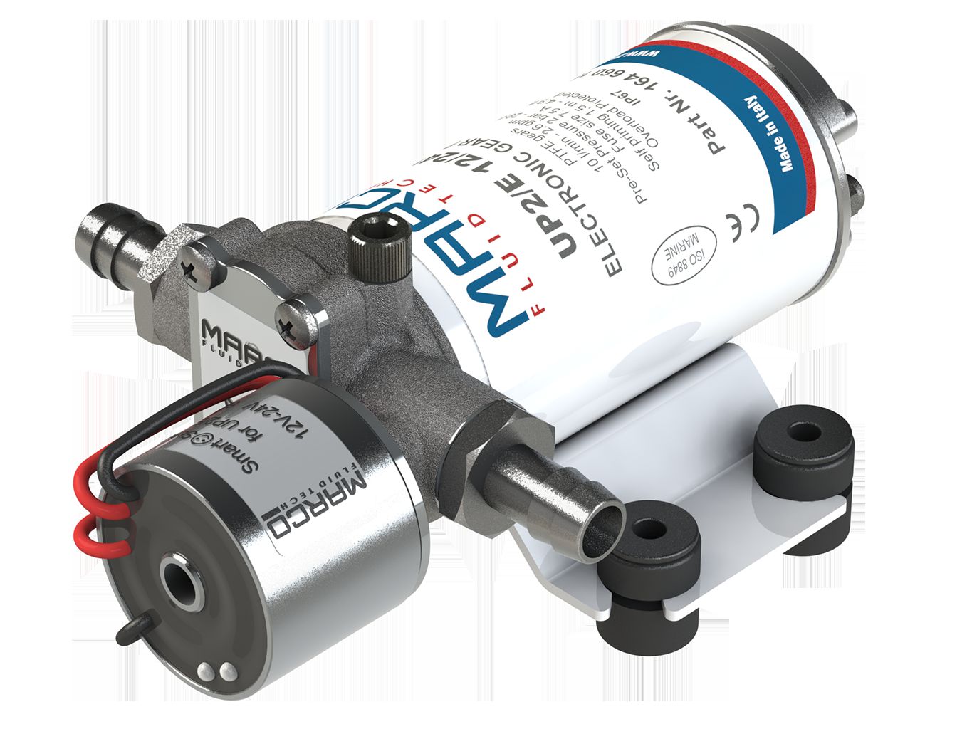 Πρεσσοστατική αντλία με ελικοειδή γρανάζια από τεφλόν PTFE, με ενσωματωμένη βαλβίδα και ηλεκτρονικό έλεγχο. Είναι μοναδική στο είδος της γιατί είναι μικρή σε μέγεθος, αθόρυβη και λειτουργεί χωρίς δοχείο διαστολής (καζανάκι πιέσεως). Το σώμα της είναι κατασκευασμένο από επινικελωμενο μπρούτζο και ο άξονας από ανοξείδωτο ατσάλι. Μεταφορά καθαρού νερού μέχρι τους 40°C. Προστασία από βραχυκύκλωμα και υπερφόρτωση. Σταματάει αυτόματα αν το υγρό στο δοχείο εξαντληθεί. Λειτουργεί σε 12V και 24V.